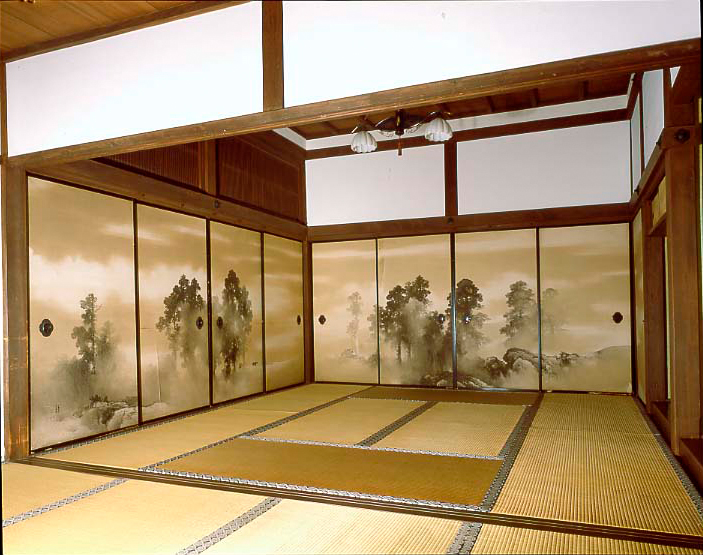 近代画壇と三千院 客殿襖絵は、明治三十九年(1906)に、京都画檀の画家たちによって奉納されました。当時若い世代であった竹内栖鳳、菊池芳文と重鎮であった望月玉泉、今尾景年、鈴木松年といった新旧の画家たちが腕を競い合い制作されたものです。 明治三十九年の時点で、玉泉七十三歳、景年六十一歳、松年五十八歳。京都画壇の大家たちを向こうにまわし、幸野楳嶺門下の四天王と呼ばれた二人、菊池芳文は四十四歳、栖鳳は四十二歳。若い世代と長老たちの画風の相違が興味深い。