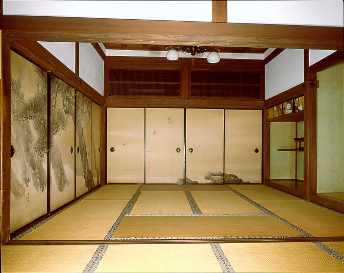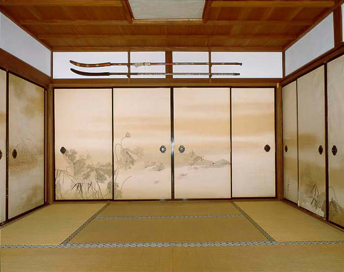 紙本墨画淡彩 各172.0×89.0 濡れ縁に面した鞘の間を飾った二面三組の襖絵。 芦雁図は、玉泉(1834-1913)の最も得意とした画題だけあって、水辺で様々な表情を見せる雁の姿を的確に描き分けている。 玉泉は望月玉蟾を祖とする望月派四代目の画家であり、望月派に岸派、四条派の作風を加味した画風で知られる。 -