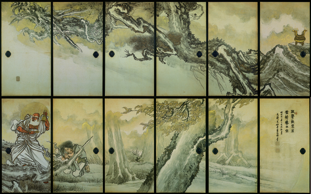 紙本墨画着色 各172.0×89.0 松年(1848-1917)は、鈴木派の祖・鈴木百年の長男。 豪快な筆力で鳴らし、「今蕭白」と呼ばれた松年の真骨頂をあらわした入魂の作品といえる。晩年の作であるが、十二面十メートル以上の長大な画面を余すことなく豪快に描いている。