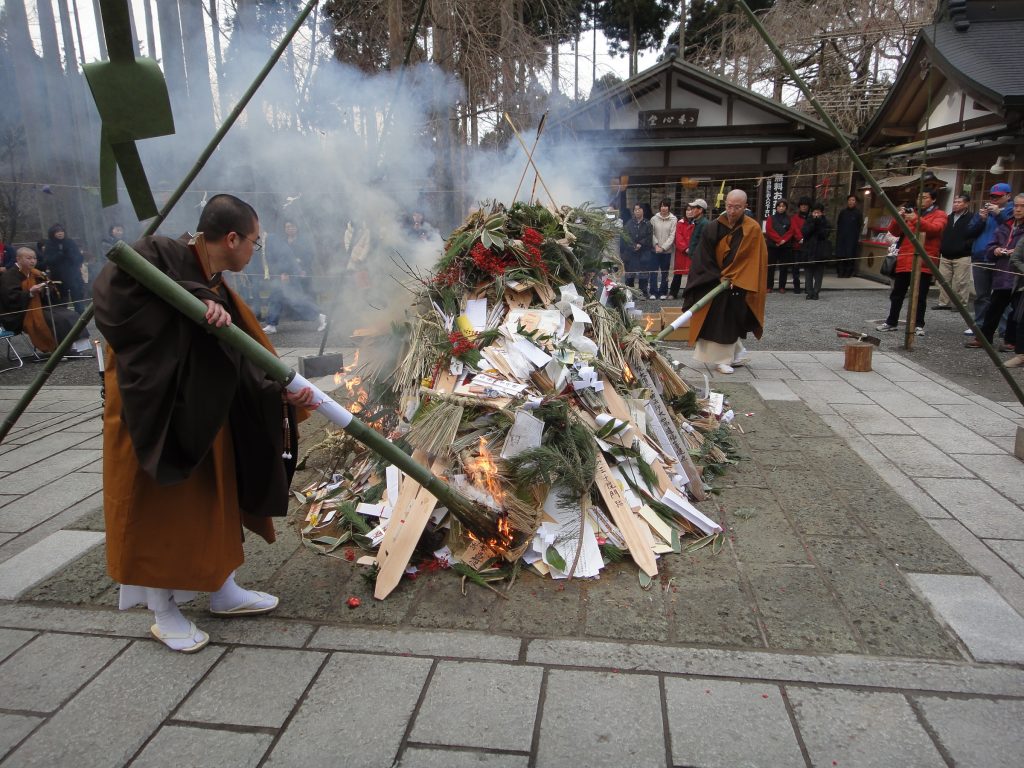 宮中における小正月の火祭行事で、正月の松や注連飾り、古い祈祷札やお守りなどを焚き上げます。